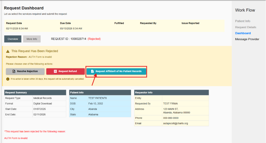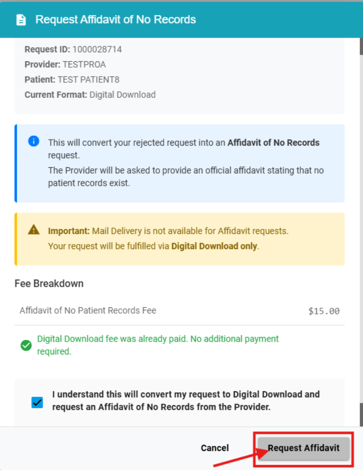 A pop-up will appear asking you to confirm that you want to request an affidavit of no records. Select Request Affidavit and your request will be resolved and the provider will be notified.
